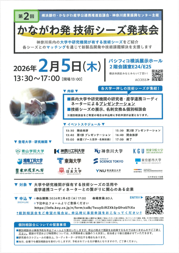「第2回かながわ発 技術シーズ発表会」が2026年2月5日(木)に開催されます。本発表会は、かながわ産学公連携推進協議会に参画する県内11大学および神奈川県立産業技術総合研究所が保有する技術シーズを地域企業に紹介し、企業の新製品開発や技術課題の解決を支援することを目的としています。