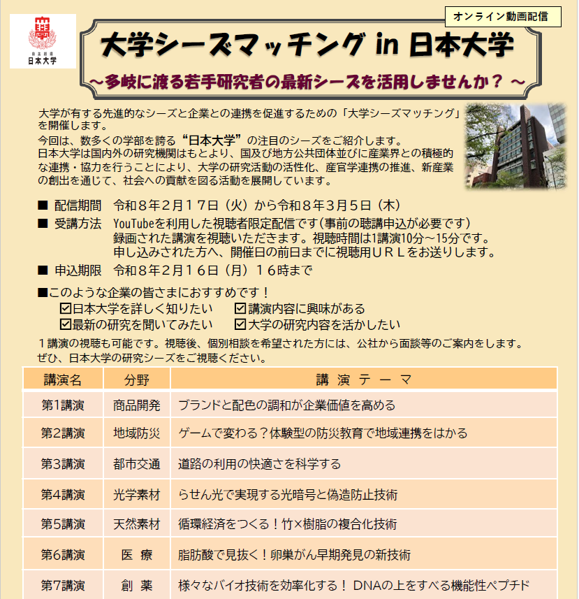 今回、「大学シーズマッチング in 日本大学~多岐に渡る若手研究者の最新シーズを活用しませんか? ~」と題し,オンラインにて動画配信を実施します。本学7名の教員が講演いたしますので、下記の配信期間中にぜひご視聴ください。
